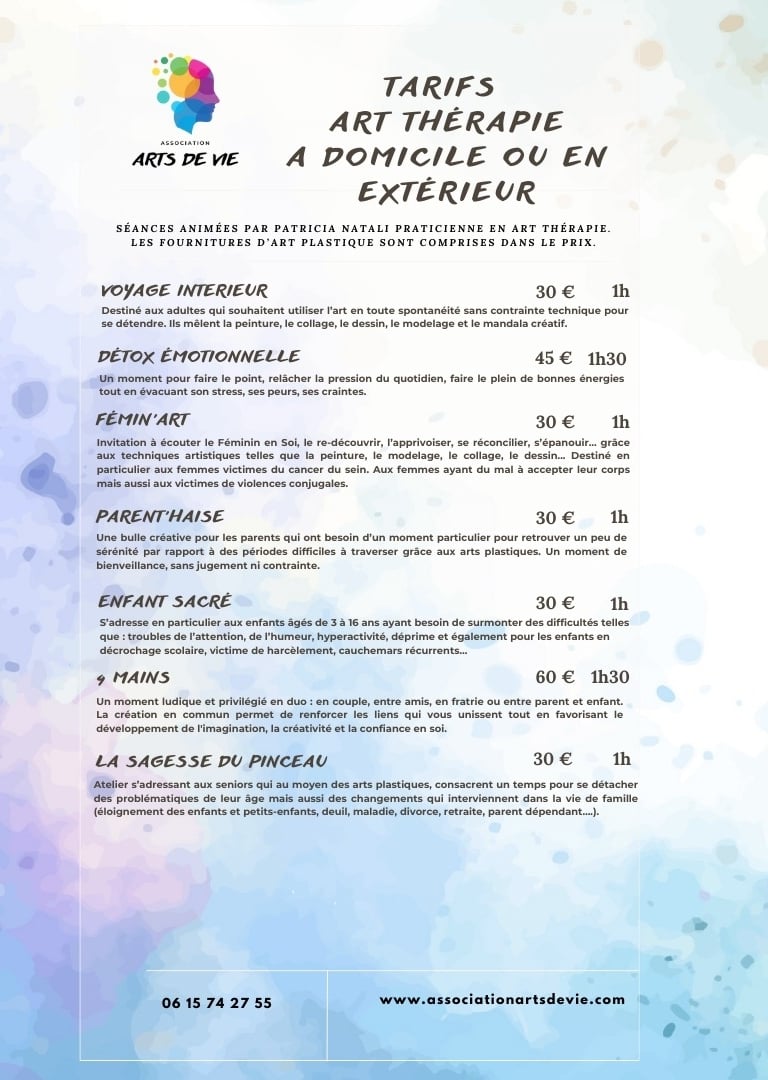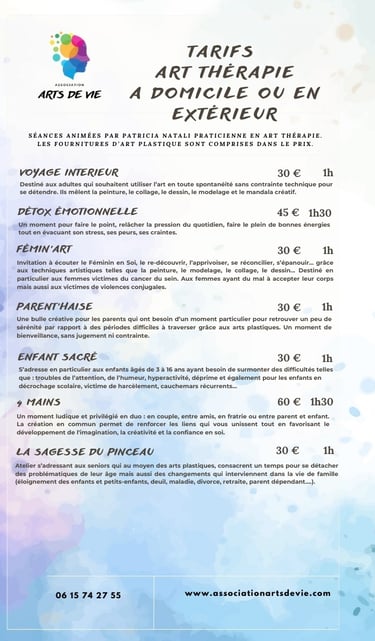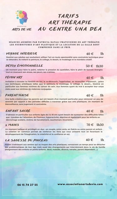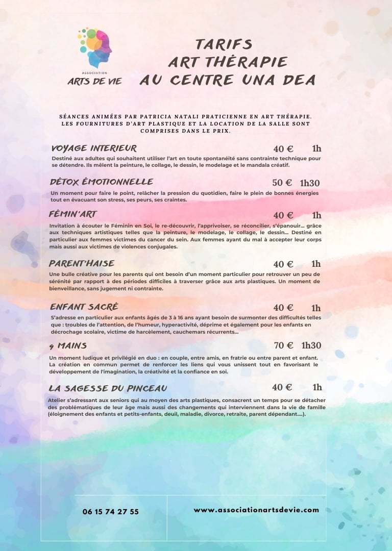 Adhésion offerte dès la première séance ou lors de la participation à un atelier animé par Patricia Natali notre praticienne en art thérapie.